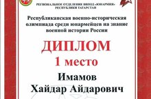 Вот уже третий год учащиеся МБОУ «Актанышская СОШ №1» участвуют в Республиканской военно-исторической олимпиаде среди юнармейцев. В данной олимпиаде проверяется знание военной истории России. В этом году на олимпиаде принял участие и стал победителем ученик 10 класса Хайдар Имамов.