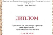 Учитель родного (татарского) языка МБОУ «Староаймановская ООШ» Г. В. Кашапова стала обладателем Диплома лауреата межрайонной научно-практической конференции “Язык-зеркало души”, организованной “Сармановской гимназией” Сармановского района по направлению “Внеурочные мероприятия”.