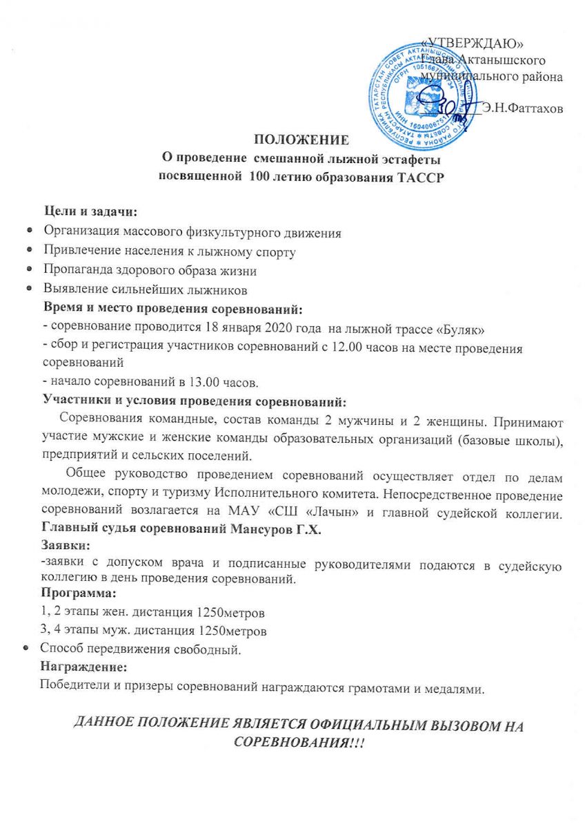 Положение о проведении смешанной лыжной эстафеты посвященной 100-летию образования ТАССР(обновленный).