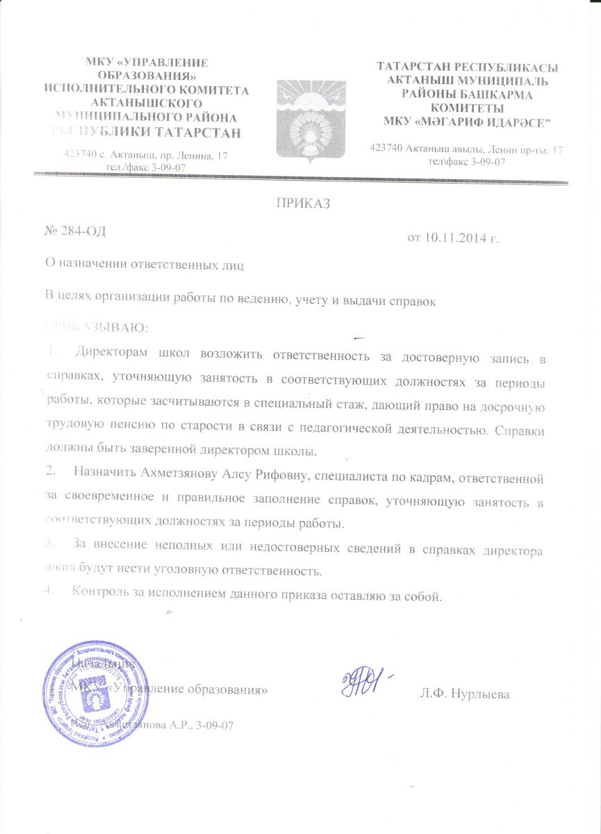 Приказ №284-ОД от 10.11.2014 года (О назначении ответственных лиц)
