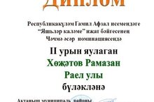 Республикакүләм Г.Афзал исемендәге “Яшьләр каләме” иҗат бәйгесендә 5 нче класс укучысы Хөҗәтов Рамазан “Чәчмә әсәр” номинациясендә II урын алып, дипломга лаек булды. ( Укытучы: Г.В.Кашапова) Котлыйбыз!!!