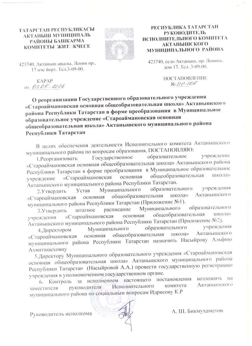 Адрес: 423739, РТ, Актанышский район, с. Старое Айманово, ул. Новая, д. 5А