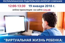 Во исполнение плана работы Министерства образования и науки Республики Татарстан 19.01.2018 с 12.00 до 13.30 состоится Республиканское родительское интернет-собрание «Виртуальная жизнь ребенка: интернет – друг или враг?». Он-лайн трансляция собрания будет вестись на сайте Казанского инновационного университета имени В.Г.Тимирясова по адресу: https://ieml.ru/.