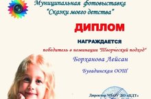 МБОУДО "ЦДТ" Актанышского муниципального района РТ подвело итоги муниципальной фотовыставки «Сказки моего детство», посвященного Дню защиты детей. Из нашей школы ученица 2 класса Борханова Лейсан стала Победителем в номинации “Творческий подход”. Поздравляем!///
