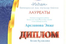 Татар телен, әдәбиятын, мәдәниятен саклау һәм үстерү, укучыларда әдәбият, сәнгатькә кызыксыну уяту, әдәби иҗатка сәләте булган яшь талантларны барлау, яшь язучыларны популярлаштыру, аларның осталыгын үстерүгә ярдәм итү максатыннан ел саен «Илһам» Бөтенроссия яшь язучылар бәйгесе үткәрелә. Бу бәйгедә безнең мәктәптән 6 нчы сыйныф укучысы Арсланова Энҗе лауреат булды һәм ТРсы Премьер- министр урынбасары ТРсы мәгариф һәм фән министрлыгының Дипломы белән бүләкләнде. Укытучысы: Мирзаянова Л.Х. Аларны чын күңелдән котлыйбыз.