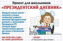 В целях формирования привлекательного образа современного педагога и повышения мотивации к получению знаний среди школьников РТ Министерством образования и науки РТ совместно с представительством газеты «Комсомольская правда» в РТ объявлен проект «Президентский дневник». Чтобы принять участие в конкурсе на «Президентский дневник» школьник должен получать отметки «5» в течение IV четверти текущего учебного года, самостоятельно или совместно с родителями отправлять в редакцию газеты «Комсомольская правда» на электронный адрес kpkzn@yandex.ru или в WhatsApp +79061118800 (необходимо указать полное Ф.И.О. ученика, район, школу, класс и контактный телефон совершеннолетнего представителя) доказательства своей успеваемости (скриншоты электронных дневников или фотографии страниц бумажных дневников) до 19 мая 2019 года включительно.