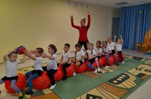 Бүген фитбол туплары кулланып шөгыль үткәрелде. Зурлар-мәктәпкә әзерлек төркеме балалары бар иде. Шөгыль сәламәтлекне ныгыту максатыннан үткәрелде. Балалар туп белән рәхәтләнеп шөгыльләнделәр. Гәүдә тотышы формалаштыру буенча мөһим бурыч үтәлде. Балаларның мотор осталыгы һәм күнекмәләре, туп – фитболларда хәрәкәт итү тәҗрибәсе бар. Тагын да сыгылучылык, көч һәм пластикны үстерү бурычы үтәлде.Упражнения с фитболом дают нагрузку на большинство групп мышц, помогают исправить осанку, улучшить координацию и повысить гибкость. Круглая форма мяча помогает выполнять движения с большей амплитудой, а его неустойчивость заставляет держать мышцы в постоянном напряжении для удержания равновесия.