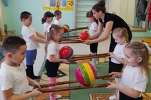 Чтобы занятия были интересными и полезными, надо использовать физические упражнения с предметами (мяч, обруч, палка). И сегодня на физкультуре дети научились катать мяч между двумя гимнастическими палками.