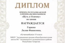 Ученица 10 класса Гараева Лилия стала призером заключительного этапа Республиканской олимпиады школьников "Путь к олимпу" по химии и награждена дипломом. Учитель химии Валиева Эльвира Фанисовна награждена грамотой за подготовку. Молодцы! Поздравляем! Так держать!