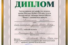 6 апрель көнне Әгерҗе шәһәрендә Мөхлисә Бубига 150 яшь тулуга багышланган төбәкара иҗади бәйге үтте. Мәктәбебез укучысы Зиннурова Лилия бәйгенең "Вокал" номинациясендә җиңү яулап, Татарстан Республикасы мәгариф һәм фән министрлыгының II дәрәҗә дипломы белән бүләкләнде. Загретдинов Илмир һәм Хәйретдинова Гөльяз сертификатларга ия булды. Котлыйбыз! Киләчәктә дә уңышлар теләп калабыз!