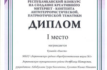 Поздравляем команду школы "Вместе", занявшую I место в номинации "Видеоролик" Республиканского конкурса на создание креативного интернет-контента антитеррористической, патриотической тематики. Руководители - Хуззятов Ильназ Наилевич, Хабибуллина Зухра Баязитовна. Молодцы! Так держать!