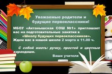 Наша школа приглашает Вас на подготовительные занятия в "Школе будущих первоклассников". Ждем Вас 2 марта в 11.00 часов. С собой иметь: ручку, простой и цветные карандаши.