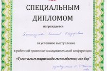 Ученица 8б класса Яхшыгулова Зайнап награждена специальным дипломом за успешное выступление в районной практико-исследовательской конференции "Туган ягым тарихында мәктәбемнең эзе бар". Руководитель - учитель татарского языка и литературы Фатхелова Ирина Рифовна. Поздравляем!