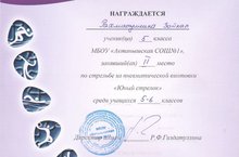 Ученица 5б класса Рахматуллина Зайнап приняла участие в соревновниях по стрельбе из пневматической винтовки "Юный стрелок". Зайнап заняла II место среди учащихся 5-6 классов и награждена грамотой. Молодец! Поздравляем!