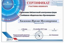 Библиотекарь школы Хисамова Нурсия Муллануровна награждена сертификатом участника вебинара "Управление библиотекой электронных форм учебников "Издательства Просвещение"".