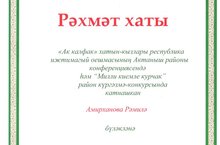 2в сыйныфы укучысы Әмирханова Рәмилә "Ак калфак" хатын-кызлары республика иҗтимагый оешмасының Актаныш районы конференциясендә һәм "Милли күлмәкле курчак" район күргәзмә-конкурсында катнашып, рәхмәт хаты белән бүләкләнде. Котлыйбыз!