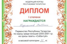 Учащийся 9а класса Нургалиев Раббани принял участие в Первенстве Республики Татарстан по корәш среди юношей 2000-2001 г.р. на призы газеты "Сабантуй" в весовой категории 55 кг. Раббани награжден дипломом I степени. Молодец! Желаем дальнейших успехов!