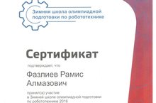 Учащийся 6А класса Фазлиев Рамис во время каникул принял участие в Зимней школе олимпиадной подготовки по роботетехнике 2016 в Университете Иннополис и награжден сертификатом. Поздравляем! Молодец!