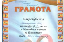 Учащийся 3 а класса Галимуллин Нияз принял участие в Новогоднем турнире по бадминтону среди юношей 2006 года и младше и занял почетное I место. Поздравляем!