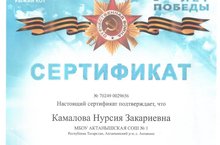 Учитель начальных классов Камалова Нурсия Закариовна награждена сертификатом автономной некоммерческой организации дополнительного образования "Центр современных дистанционных образовательных технологий" за подготовку победителей V Всероссийской олимпиады по математике для 1-4 классов "Рыжий котенок". Поздравляем!