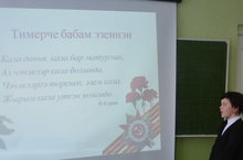 4А сыйныф укучысы Хазиева Таңсылу (сыйныф җитәкчесе - Ахунова Илиза Энгеловна) Бөек Җиңүнең 70-еллыгы уңаеннан үзенең бабасы турында сөйләде. Аның истәлеккә калган документларын, бүләкләрен зур горурлык белән күрсәтте.
