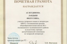 Учитель татарского языка и литературы Аглетдинова Ландыш Филусовна награждена почетной грамотой за подготовку призера республиканской олимпиады по татарской литературе. Спасибо за Ваш труд, Ландыш Филусовна!