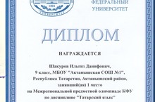 Дипломом награжден ученик 9 класса Шакуров Ильгиз Данифович, занявший I место на Межрегиональной предметной олимпиаде КФУ по дисциплине "Татарский язык" (учитель - Фатхелова Ирина Рифовна). Молодец, Ильгиз!