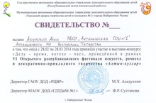 Ахунова Алия приняла участие в выставке-конкурсе "Делу - время. потехе- час", проведенной в рамках VI Открытого республиканского фестиваля искусств, ремесел и декоративно-прикладного творчества "Алтын куллар" и награждена сертификатом. Молодец, Алия! Так держать!
