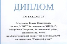 Ученица 9 класса Марданова Радиса Ильнуровна (учитель - Фатхелова Ирина Рифовна) награждена дипломом за III место на Межрегиональной предметной олимпиаде КФУ по дисциплине "Татарский язык". Молодец, Радиса!
