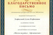Ученица 7А класса Хафизова Алия (классный руководитель - Галиева Л.Р.) награждена благодароственным письмом Актанышской центральной детской библиотеки за активное участие в муниципальном этапе Республиканского конкурса "Место подвига - Афганистан". Молодец, Алия!