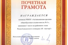 Почетной грамотой награждена команда школы, занявшая 1 место на районном этапе Республиканского конкурса"Я - мастер!" (учитель - Мухамадиев Дильшат Сагитович). Дальнейших успехов вам, ребята!