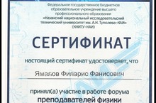 Сертификатом участника Форума преподавателей физики Республики Татарстан награжден учитель физики Ямалов Филарис Фанисович. Желаем ему дальнейших успехов и побед!