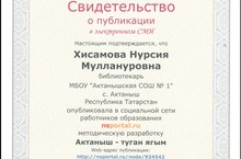 Библиотекарь школы Хисамова Нурсия Муллануровна опубликовала в социальной сети работников образования nsportal.ru методическую разработку "Актаныш - туган ягым". Web-адрес разработки: http://nsportal.ru/node/924542//