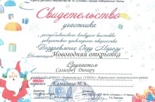 Ученик 4Б класса Салихов Динар награжден свительством участника Республиканского конкурса-выставки декоративно-прикладного твочества "Поздравление Деду Морозу" (педагог - Камалова Н.З.). Молодец, Динар!