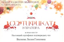 Учитель начальных классов Валиева Лилия Глюсовна награждена сертификатом за подготовку победителей I тура VI Всероссийской дистанционной олимпиады по математике для 1-2 классов.