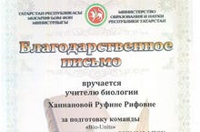 Учитель биологии Ханнанова Руфина Рифовна была награждена благодарственным письмом от первого заместителя министра Д.М.Мустафина за подготовку районной команды "Bio-units" - участницы лиги "Юниоры" III республиканского Турнира юных биологов. Дальнейших успехов вам, Руфина Рифовна!