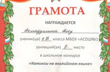 Учениөца 4Б класса Ахмадуллина Алсу, занявшая II место на школьном конкурсе "Комиксы на английском языке", награждена грамотой. Так держать, Алсу!
