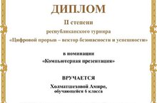 6В сыйныф укучысы Холматшаехова Амира республикүләм «Цифровой прорыв - вектор безопасности и успешности» дигән турнирда катнашып, II дәрәҗә диплом белән бүләкләнде. Укытучысы Гареева Луиза Илдар кызы. Котлыйбыз!