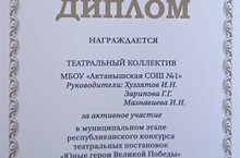 В МБОУ "Актанышская СОШ №1" уже долгие годы работает театральный клуб. В театральном клубе занимаются заинтересованные учащиеся из всех параллелей, а также педагоги. Театральный коллектив учащихся принял активное участие в муниципальном этапе республиканского конкурса театральных постановок "Юные герои Великой Победы" и был награжден дипломом.