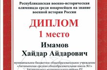 Республикакүләм хәрби-тарихи олимпиадада мәктәбебезнең 10 сыйныф укучысы Имамов Хәйдәр 1 урын яулады. Котлыйбыз!