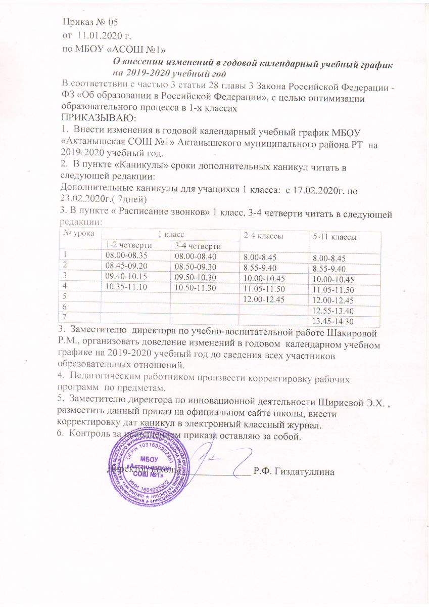 Приказ о внесении изменений в годовой календарный учебный график на 2019/2020 учебный год