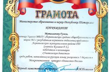 7в сыйныф укучысы Муталлапова Гузәл регионара "Россия династияләре" конкурсында җиңүче булды. Әлеге конкурста Гүзәл 7-8 класс укучылары арасында рус телендә язылган эше белән "Укытучы династиясе" номинациясендә җиңеп, Грамотага ия булды (укытучысы Кулиева Р.З.). Котлыйбыз!