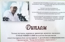 Халык язучысы, күренекле драматург, җәмәгать эшлеклесе Туфан Миңнуллин истәлегенә багышланган укытучыларның һәм укучыларның I республика конференциясенең "Драматургия. Театр яктылыкка, нурга илтә!.." (пьеса) номинациясендә Кызыксындыру буләге белән мәктәбебезнең 11 нче сыйныф укучысы Хаеретдинова Зөлфия бүләкләнә. (җитәкчесе - Камаева Э.Р.)
