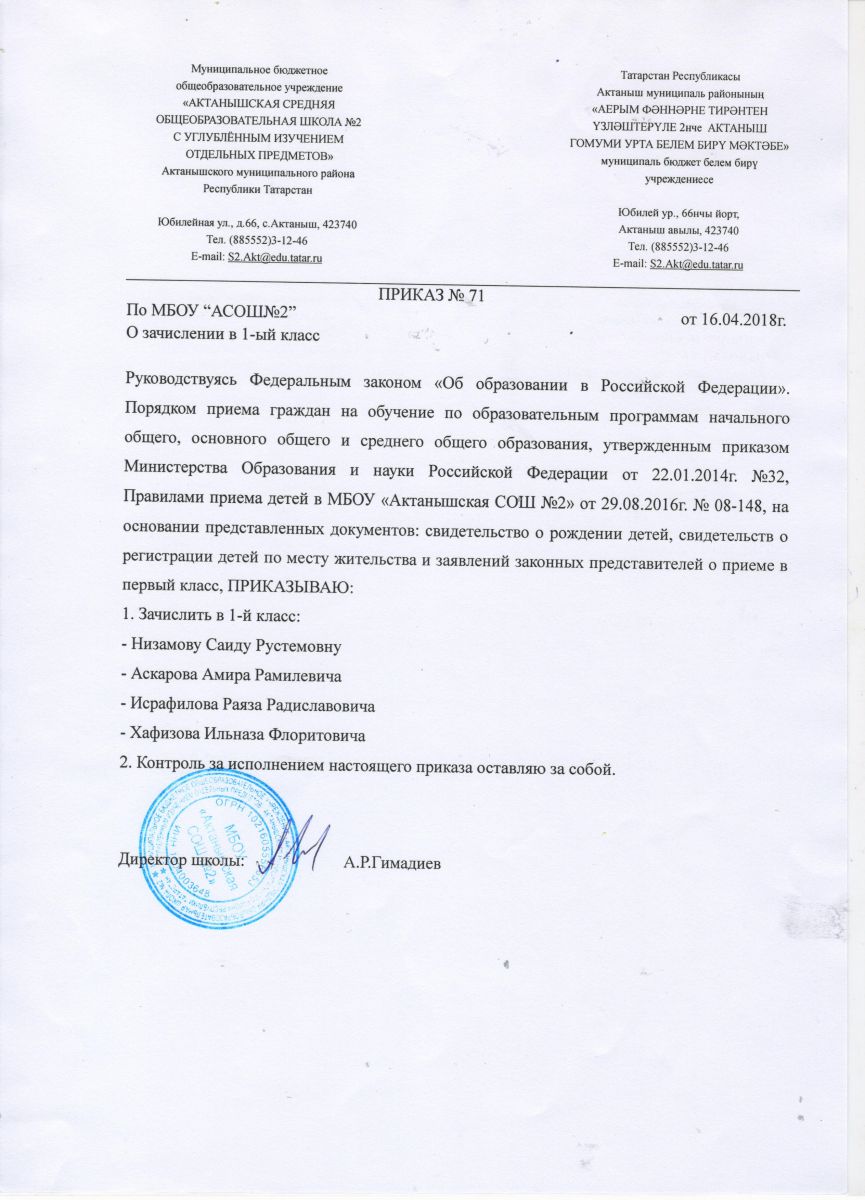 Приказ о зачислении в 10-й класс от 31.08.2018