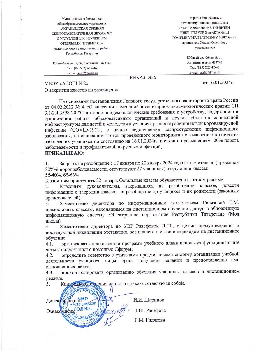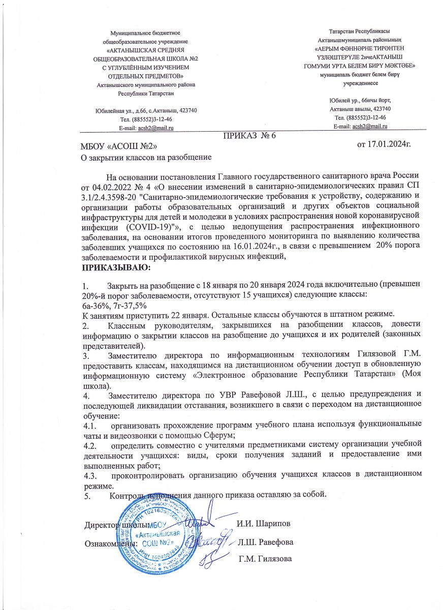 Приказ о закрытии классов на разобщение - 17.01.2024