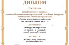 ученик 8б класса Жадов Артём(научный руководитель Шакиров И.А.) награждён Дипломом II степени в номинации "Конкурс видеороликов "Я помню - я горжусь!";