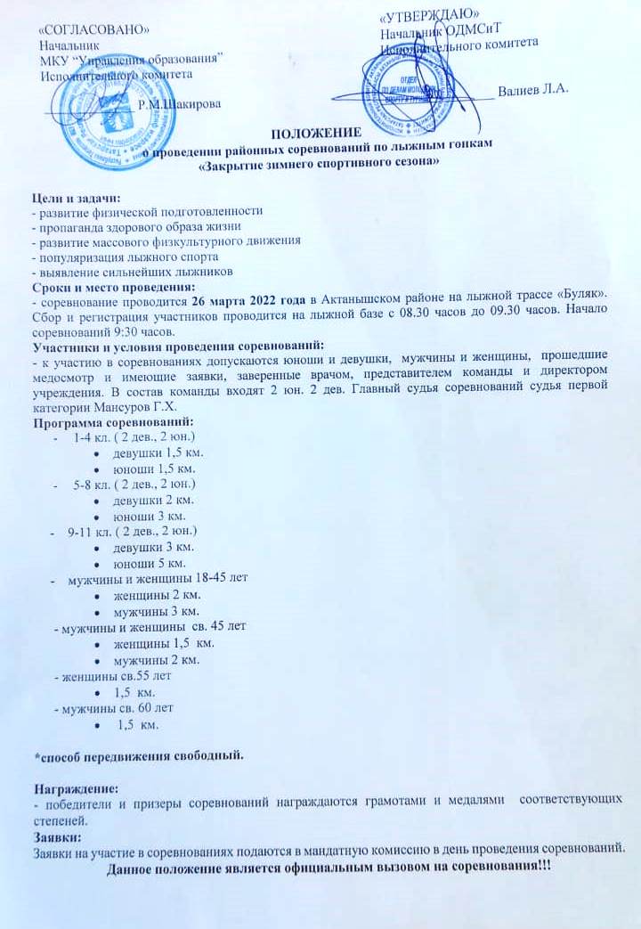 26 марта на лыжной трассе "Буляк" состоятся районные соревнования по лыжным гонкам в честь закрытия зимнего спортивного сезона. Сбор и регистрация участников проводится на лыжной базе с 08.00 до 09.30 часов. Начало соревнований 9.30 часов.