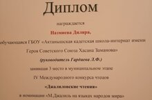 Ученица 9б класса нашей школы Назмиева Диляра(руководитель Гардиева Л.Ф.) заняла III место в муниципальном этапе IV Международного литературного конкурса чтецов "Джалиловские чтения" в номинации "М.Джалиль на языках народов мира".