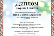 Ученик 8б класса нашей школы Петин Савелий(руководитель Латыйпова М.М.) награждён Дипломом I cтепени Всероссийского конкурса детского творчества с Международным участием "Здравствуй, Дедушка Мороз!", посвященному главному волшебнику Нового года в номинации "Декоративно-прикладное искусство".