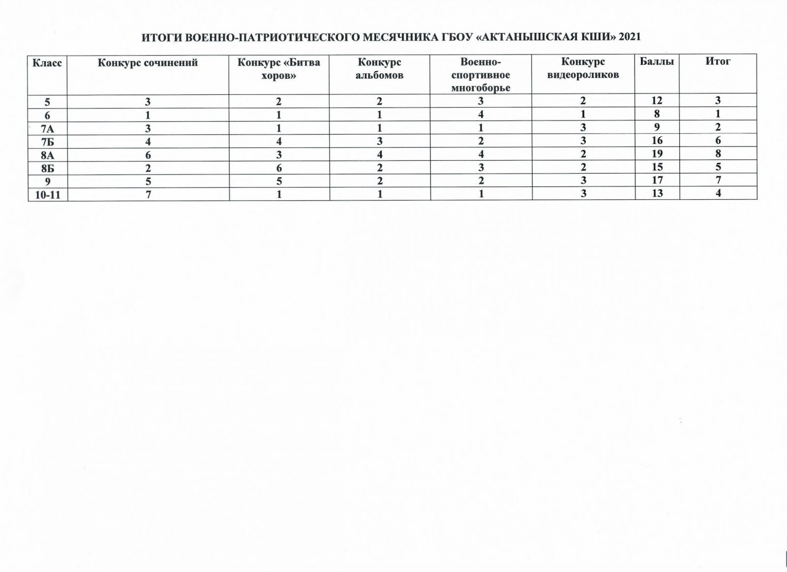 ИТОГИ МЕСЯЧНИКА ПО ВОЕННО-ПАТРИОТИЧЕСКОЙ РАБОТЕ СРЕДИ КЛАССОВ АКШИ